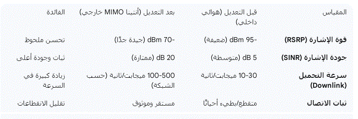 - تحسين الإشارة (RSRP/SINR): يمكن توجيه الأنتينا الخارجي مباشرة نحو أقرب برج، مما يقلل من الضوضاء ويحسن من جودة الإشارة المقيّمة (SINR).