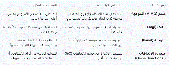 نوع الانتيناالخصائص الرئيسيةالاستخدام الأمثلميمو (MIMO) الموجهةتستخدم تقنية الإدخال والإخراج المتعدد، موجهة (ذات اتجاه محدد)، ذات كسب عالٍ.للمناطق البعيدة عن الأبراج، ولتحقيق أعلى سرعة وثبات.ياغي (Yagi)موجهة للغاية، تصميم طويل ونحيف، كسب عالٍ جداً.للاستقبال من مسافات بعيدة جداً باتجاه واحد محدد.اللوحية (Panel)موجهة، مسطحة ومربعة، توفر توازناً جيداً بين الكسب والتصميم.للمواقع ذات التغطية الضعيفة والمتوسطة، سهولة التركيب نسبياً.متعددة الاتجاهات (Omni-Directional)تستقبل الإشارة من جميع الاتجاهات (360 درجة)، كسب أقل.للمواقع القريبة من أبراج الاتصالات، أو عندما يكون اتجاه البرج غير معروف.