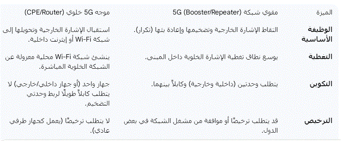 غالبًا ما يخلط المستخدمون بين وظيفة مقوي شبكة 5G (Repeater/Booster) والموجه الخلوي (CPE - Customer Premises Equipment)، وكلاهما يعزز استقبال 5G بطرق مختلفة: